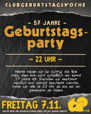 Heute lassen wir so richtig die Sau raus, denn man wird schließlich nur einmal 57 Jahre alt. Nachdem wir bestimmt reichlich und sinnvoll beschenkt wurden, laden wir alle ab 22 Uhr zu uns ein, um gemeinsam zu feiern.