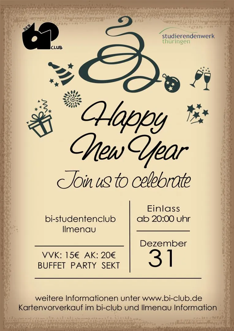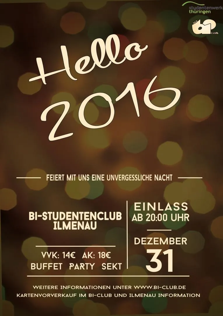 Hello 2016 - heißt zusammen mit uns am 31.12 im bi-Studentenclub das neue Jahr willkommen. Das leckere Buffet könnt ihr ab 20 Uhr genießen und später mit einem Gläschen Sekt und riesiger Party, hübschgekleidet, das alte Jahr verabschieden und bis zum Sonnenaufgang feiern. Für alle, die erst später hinzukommen möchten, gibt es ab 12 Uhr, nachdem wir zum Kalten Buffet umgebaut haben, angepasste Eintrittspreise. Seid dabei!