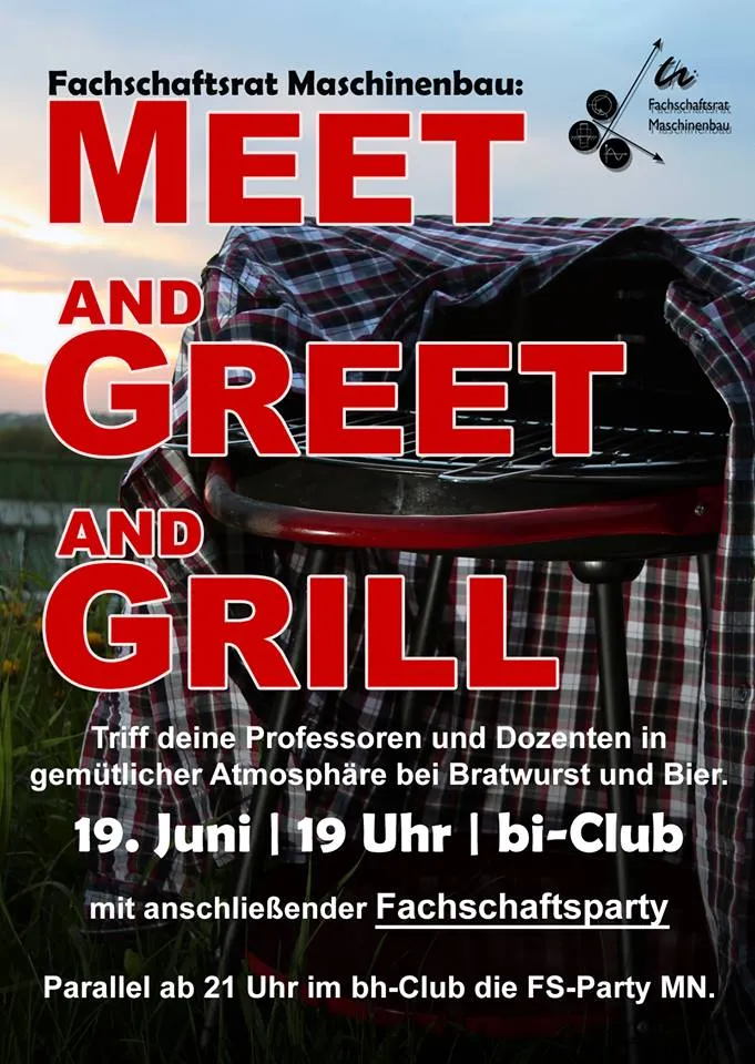 Wir möchten Euch dieses Semester wieder zum "Meet and Greet and Grill" ab 19:00 vor und in dem bi-Club einladen. Es sind dazu alle Professoren und Mitarbeiter der Fakultät MB eingeladen. Dabei werden einige Ihre Geschichten aus dem Leben und der Karrierelaufbahn in einer gemütlichen Runde zum Besten geben :-)