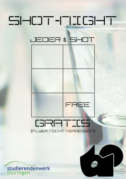 Nimm dir in am Einlass, im Bi-Club, eine Stempelkarte mit, trinke 5 Kurze und bekomme einen gratis dazu.