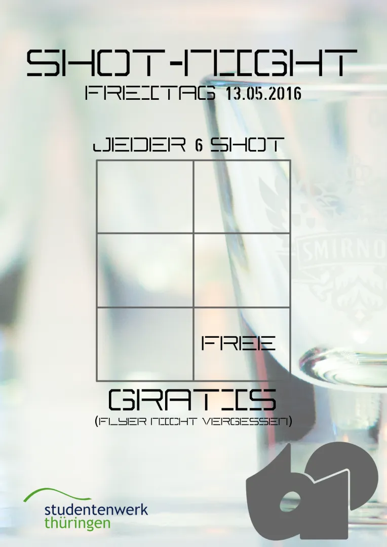 Nimm dir in der Mensa oder am Einlass eine Stempelkarte mit, trinke 5 Kurze und bekomme einen gratis dazu.