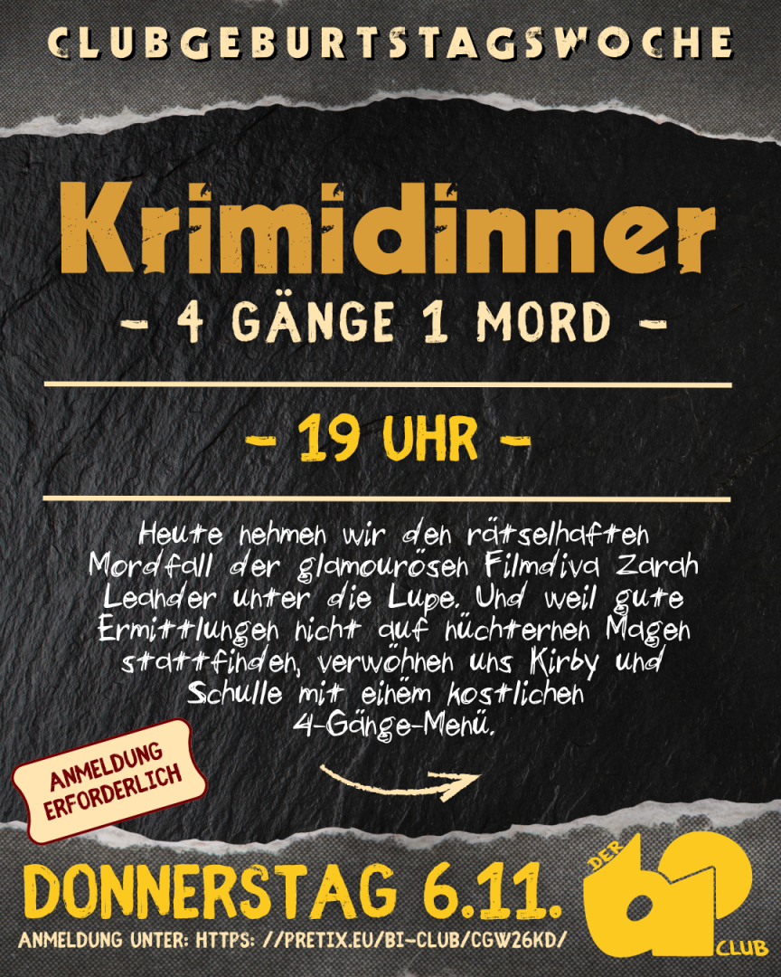 Heute erwartet euch ein ganz besonderes Event: Unser erstes Krimi-Dinner! Inmitten eines mysteriösen Mordfalls an der glamourösen Filmdiva Zarah Leandros taucht ihr ein in eine Welt voller Spannung, Intrigen und Genuss. Während ihr versucht, den Fall zu lösen – oder geschickt von euch abzulenken – verwöhnen euch unsere herausragenden Köche Kirby und Schulle mit einem exquisiten 4-Gänge-Menü.